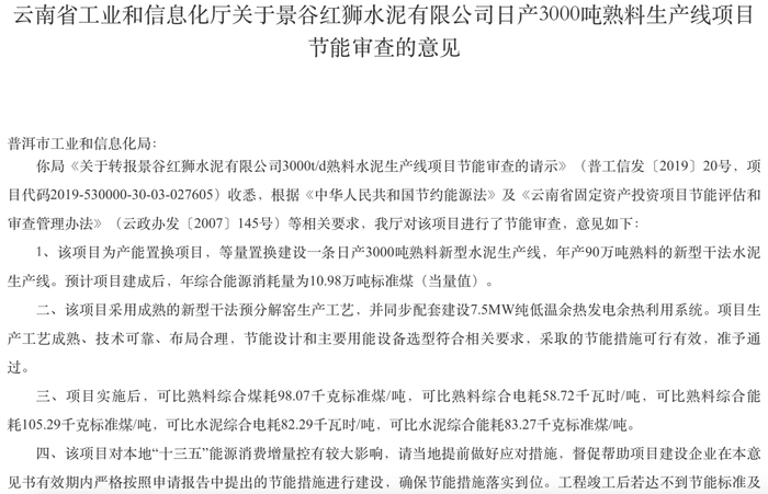 今年4月,云南省工信厅印发《关于景谷红狮水泥有限公司日产3000吨熟料生产线项目节能审查的意见》,批准通过了日产3000吨熟料生产线项目的节能审查,预计项目建成后,年综合能源消耗量为10.98万吨标准煤。