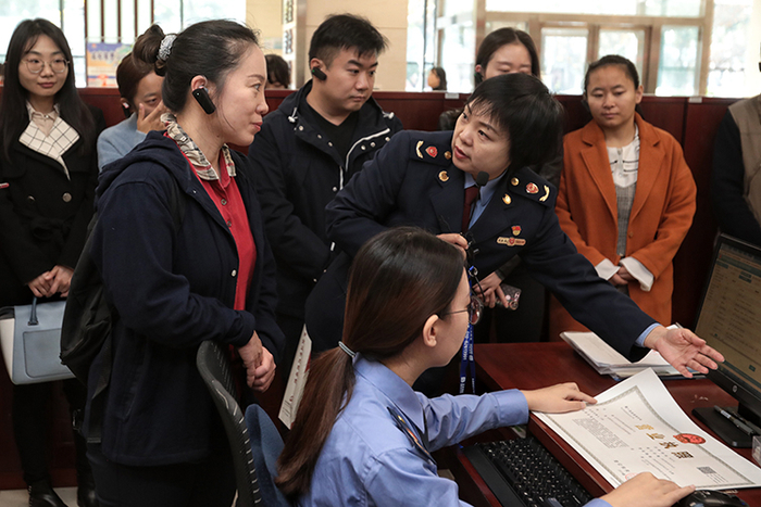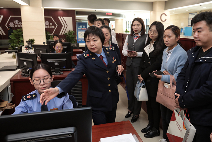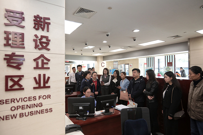 群众代表在工作人员的带领下,观看营业执照的申领流程。
