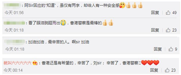 同是22日凌晨,香港商报网也在其微博上发出一段视频,并写道:“加油!加油啊,阿Sir,靠哂你哋啦!(靠你们啦!)”路边市民撑警,“知道!”阿Sir边行进边答。10月21日晚香港元朗感人一幕。↓