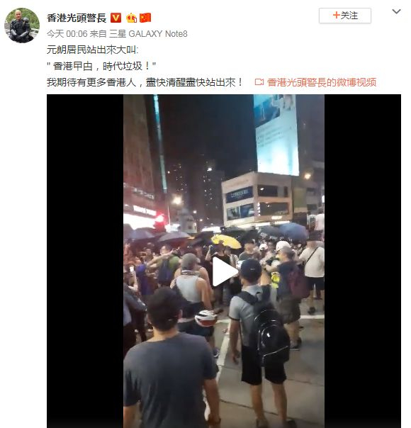 22日凌晨,香港“光头警长”刘sir在微博发布了一段大批市民齐声高喊“ 香港曱甴,时代垃圾!”的视频。并附文表示:元朗居民站出来大叫:“香港曱甴,时代垃圾!”我期待有更多香港人,尽快清醒尽快站出来!↓
