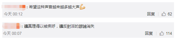 还有网友表示:希望这种声音原来越大声,“让真理得以被疾呼,让反对派的谬论消失”↓