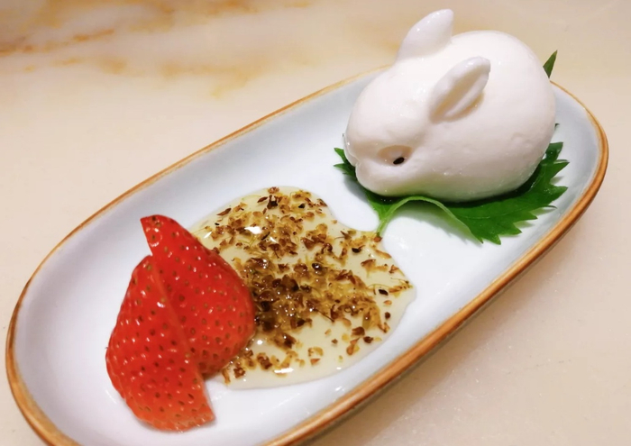 此外,这里还有一道“软萌”的菜品——杏仁豆腐。做成了小兔子形状的杏仁豆腐配合的正是香甜的桂花酱,让很多人大呼“可爱到不忍下嘴”。白兔、桂花,很容易让人联想到月宫,算得上将美食的“诗意升华”了。