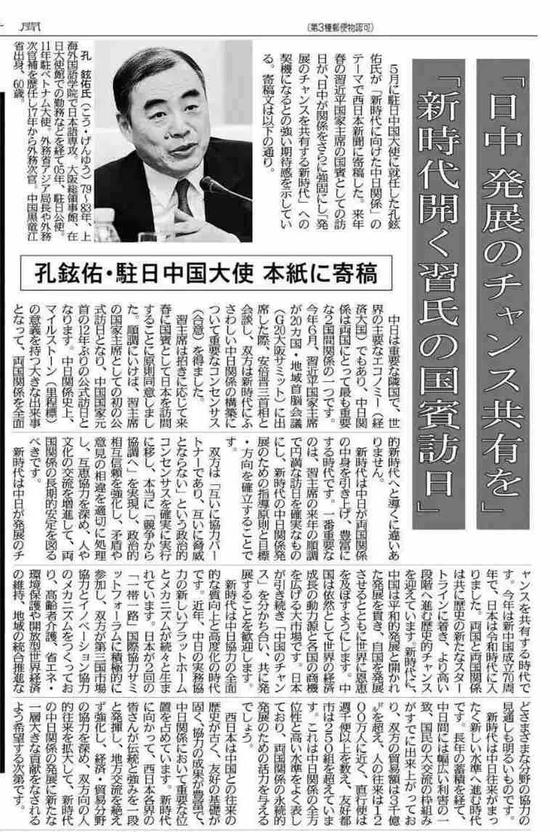 就在王岐山抵达日本的当天,驻日大使孔铉佑在《西日本新闻》发表了一篇题为《面向新时代的中日关系》的署名文章。文章第一句就说,“中日是重要邻国,也是世界主要经济体,中日关系对两国来说都是最重要的双边关系之一。”