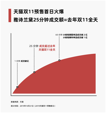 据“双11”预售首日10月21日的数据,雅诗兰黛品牌仅预售25分钟,便实现交易额近5亿,超过了去年双11全天的成交额,刷新了纪录。截至10月22日17:00,雅诗兰黛DW持妆粉底液已预订6.26万次,沁水粉底液已预订5.35万次。以50元的定金计算,雅诗兰黛仅预售期间的定金收入便达到580.6万元,进而有望在“双11”期间为品牌带来5000多万元的预期销售额。