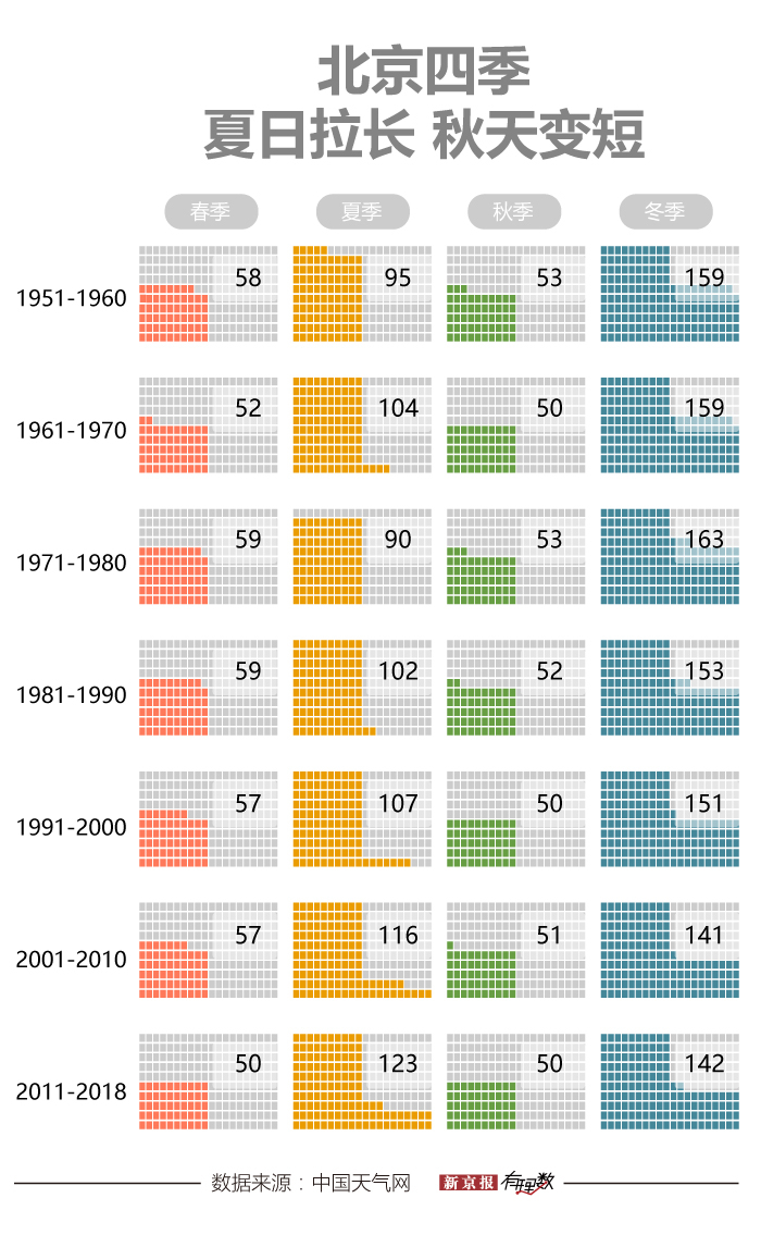 不仅如此,这几十年来,北京的夏天还在变长,秋天或多或少在被压缩。