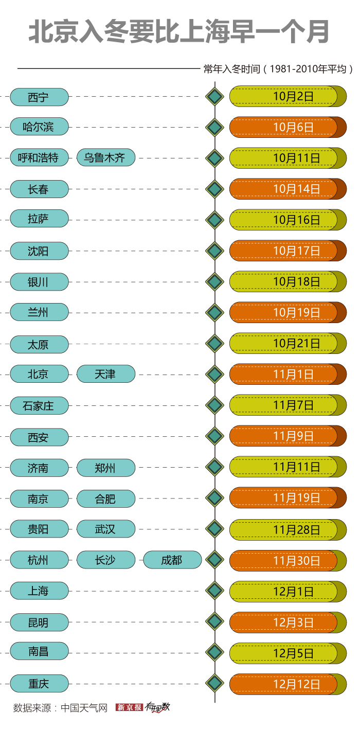 从常年(1981-2010年平均)的入冬时间来看,还有一周左右时间北京就要入冬了,这比上海整整早上一个月。是的,当上海人在满街桂花香气中沉醉时,北京人早已经默默地穿上了秋衣秋裤。