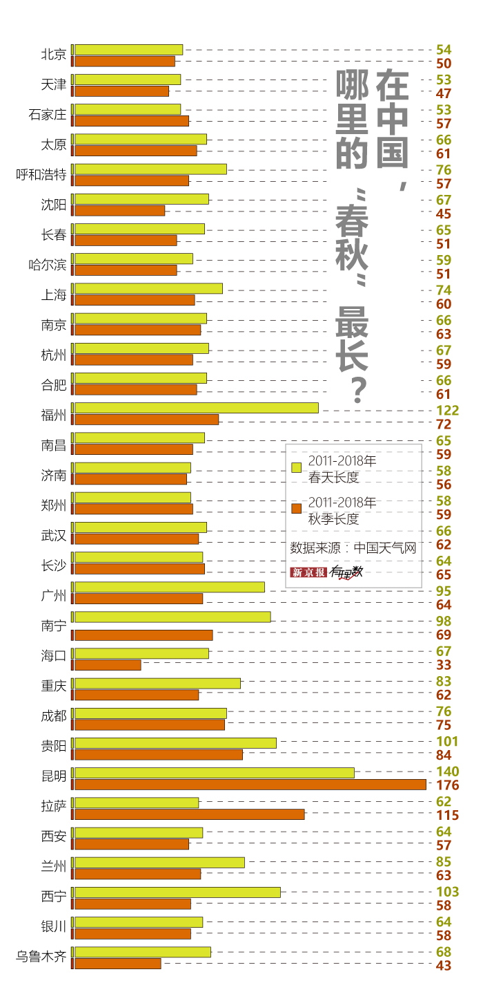 在 31 个省会和直辖市中,只有海口、乌鲁木齐、沈阳和天津的秋天短过北京,像昆明、拉萨两地,秋季的长度都要 100 天以上;四季如春的昆明,春秋两季加在一起有 316 天,是北京的三倍多。