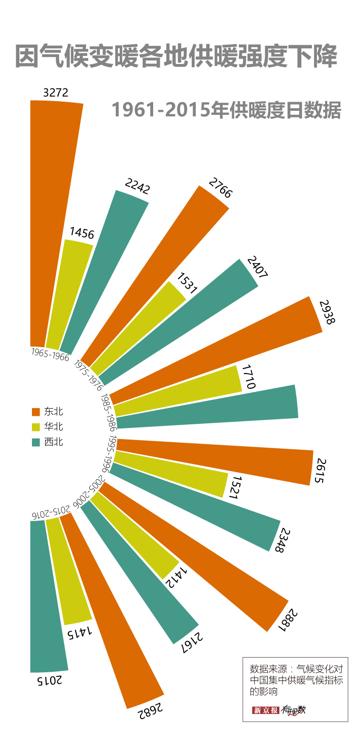 有关气候统计数据显示,从 1961 年到 2015 年,东北、华北、西北地区集中供暖度日(日平均气温与规定的基础温度的离差,数值大说明供暖期温度低、供暖强度大)均呈减少趋势,即供暖强度减弱。