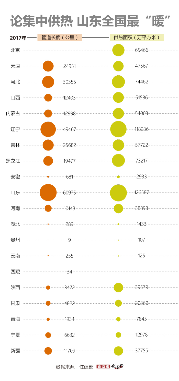 值得注意的是,在这些集中供暖的地区之中,无论是从管道长度还是供热面积来看,山东都是中国“最暖”的地方,在中国超过 22% 的集中供暖管道铺设在山东,山东的集中供热面积占到全国的 15% 。
