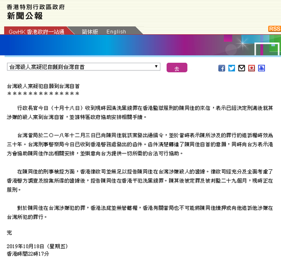 10月18日,香港特区政府发布新闻稿称,行政长官林郑月娥收到陈同佳的来信。信中,陈同佳称,已决定刑满后就其所涉嫌的杀人案到台湾自首,并请特区政府协助安排相关手续。