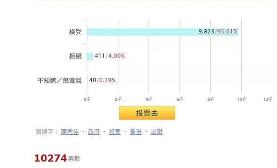 截至23日中午11点30分,参与投票者达10274人,认为陈同佳若来台投案,政府应接受的网友有9823个,比率为95.61%;411个网友认为陈同佳若来台投案,政府应拒绝,比率为4%。