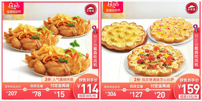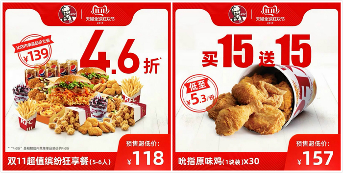肯德基首页推送的“双11超值缤纷狂享餐”,十分醒目的“4.6折”让人看了着实心动,目前已经预订了将近3万份。允指原味鸡“买15送15”的预售也算是跟麦当劳“杠上了”,不过兑换有效期为180天,让有“囤货癖”的人也松了口气。
