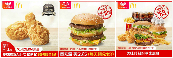 麦辣鸡翅买10送10、经典巨无霸买5送5……麦当劳的“双11”预售看着还是十分诱人的。除了鸡翅和汉堡的买送,“美味时刻纷享家庭餐”的预售价格也低至69元,几乎是打了对折。此外,满额还可以领取10元到100元不等的优惠券,购物津贴也可以使用。