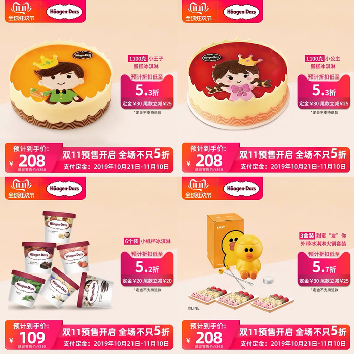 哈根达斯打出了“双11抢先预售,全场5折起”的口号,除了满额领券,爆款冰淇淋蛋糕、6个装的小纸杯冰淇淋、外带冰淇淋火锅套餐、中杯华夫筒冰淇淋……只要你能想得起来的哈根达斯产品,几乎无一例外参加活动。