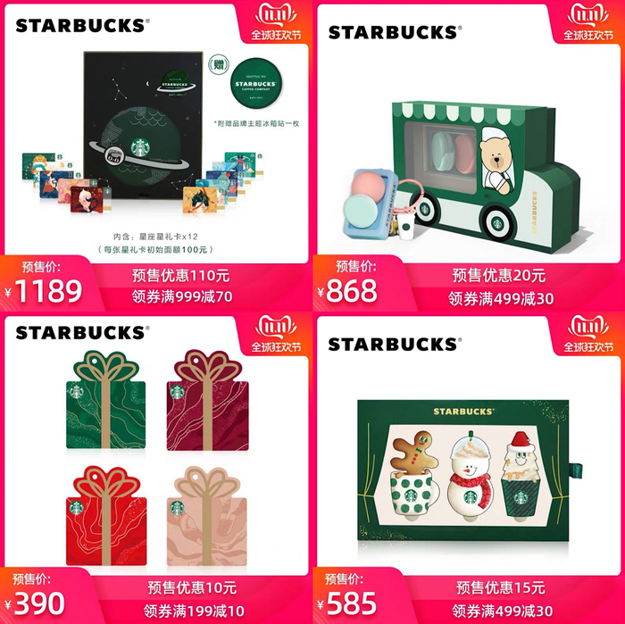 星巴克的“双11”力度略小,目标人群主要是“以咖啡续命”的“重度星巴克爱好者”,比如12张一套的星座星礼卡、马卡龙造型的星礼卡、圣诞四重奏星礼卡等,毕竟星巴克的大批粉丝就算没有优惠也要买,有了活动哪怕优惠一点点,也是锦上添花。咖啡豆、咖啡杯等并没有参加双11的预售活动。
