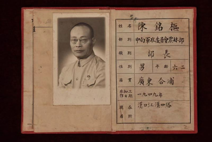 “这是我父亲在1949年上半年,他剃了个光头......”谈起文物中印象最深刻的是哪一个,陈佛仔拿着父亲当年的“中南军政委员会工作人员服务证”向记者介绍道。当时开政协筹备会的时候,陈铭枢已经成了平头。“政协有个筹备会刊上也有我父亲的照片,就跟这个照片形象完全一样。”