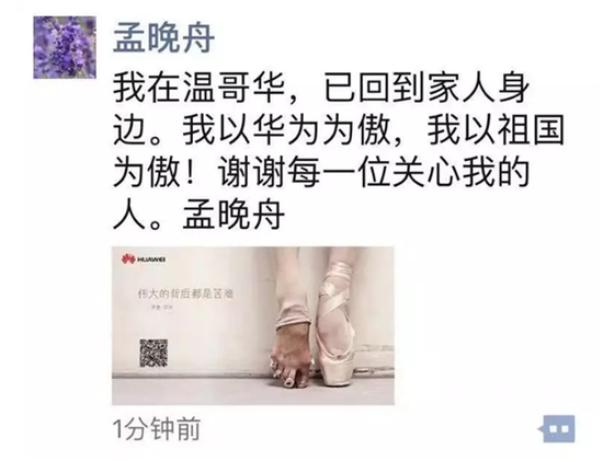 此前报道一:孟晚舟刚刚发出一条朋友圈,这句话震撼人心!