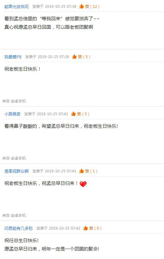 在这条孟晚舟朋友圈文章下面,许多华为员工纷纷留言:看到“等我回来”那句感觉要泪奔,“祝老板生日快乐”、“希望孟总早日归来”!还有人说,“光鲜的背后都是磨难”。↓↓