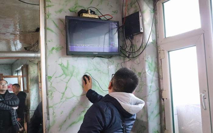 梅华在“火流星”目击者家中查看当时的监控画面。摄影/新京报记者 周博华