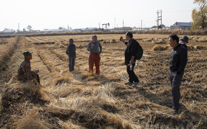 “陨石猎人”在农田里向当地居民打听情况。摄影/新京报记者 周博华