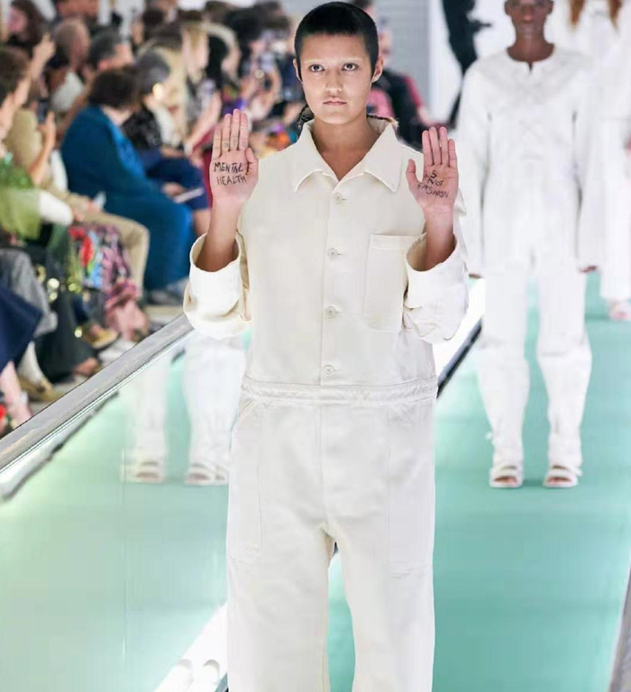 模特在手上写着“mental health is not fashion”以示抗议