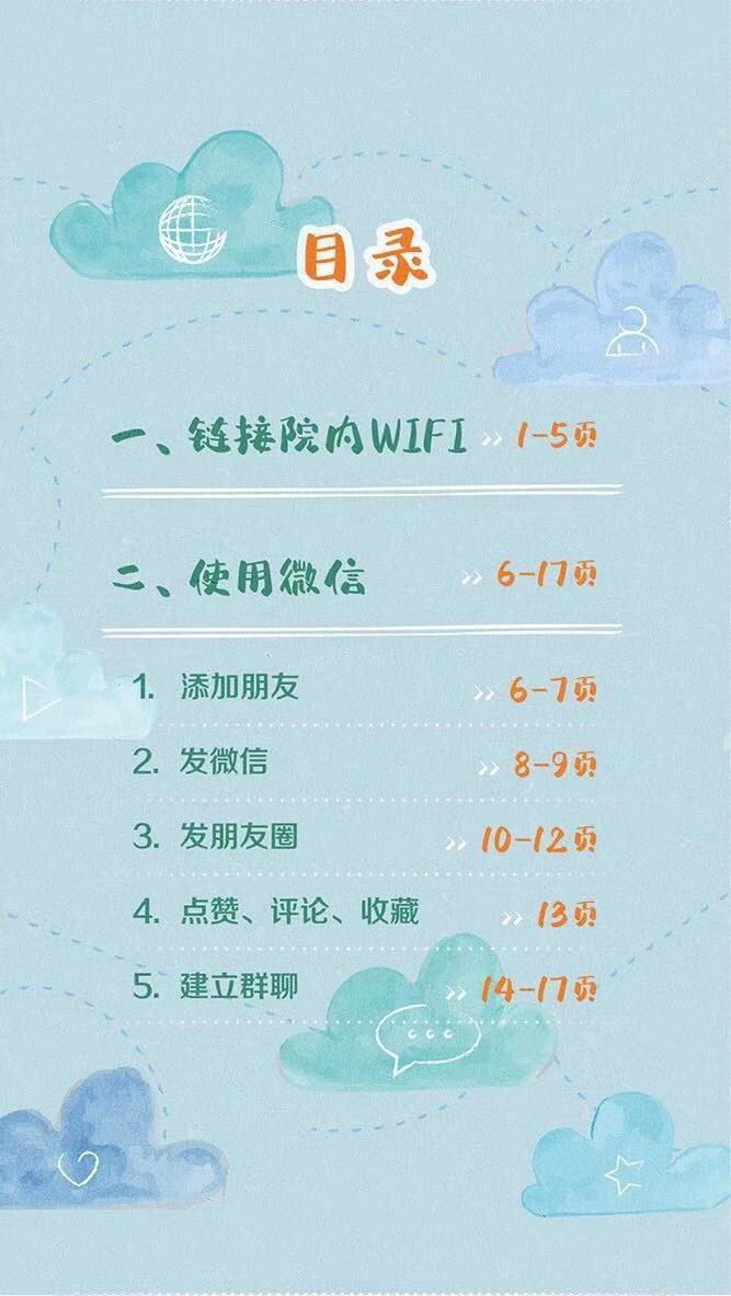 经过一周时间,护理员的手绘教程初稿形成,首批老人使用,看不懂的地方再进行修改,最终确定了17页内容。院内20多位首批使用微信手册的老人都可以使用微信最主要的功能,有学习意愿的老人再进阶到后续学习移动支付、打车软件等内容。