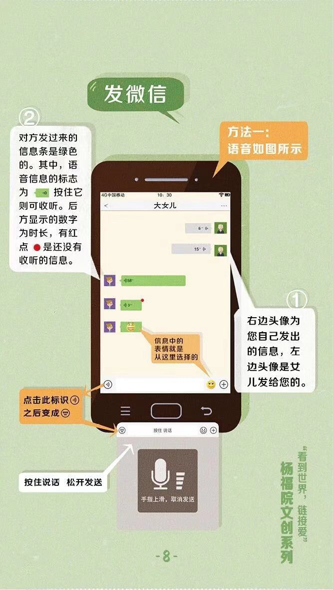 杨浦区社会福利院在开设“银发课堂”中发现,老人最想学习的就是如何使用微信,而在微信功能中最想学的功能依次是:视频通话、发微信、发语音和发朋友圈。几位负责“银发课堂”的95后护理员发现,市面上很多教老人使用手机的教材,内容太多又太复杂,老人一看教材很有压力,就想放弃,感觉自己学不会。同时,教材多以文字为主,图为辅,老人看了半天消化不了,眼睛看得又很吃力,光靠手把手教,老人回去自己操练时,基本忘光了。因此,3位95后护理员决定自己来编撰手绘出适合高龄老人使用的教程。