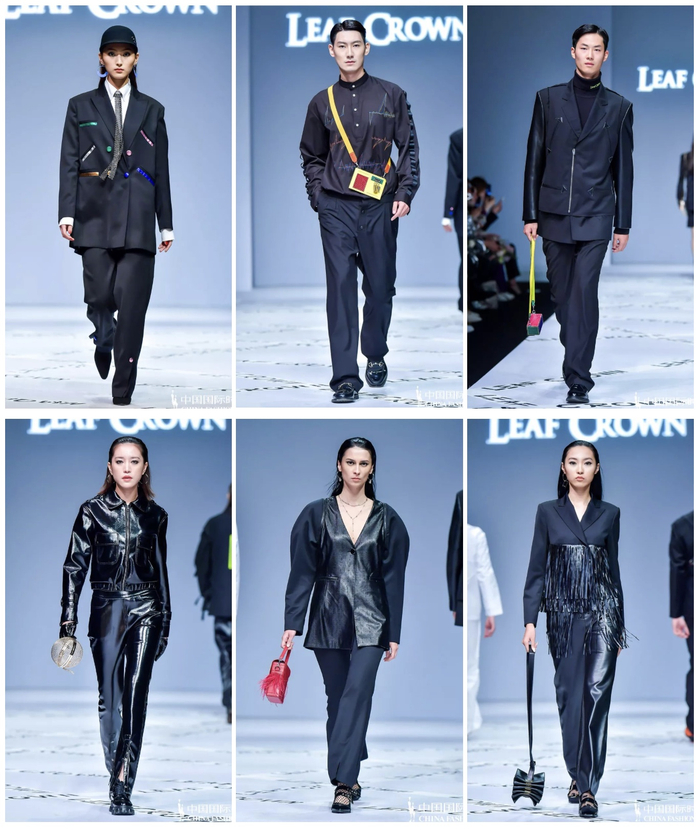 LEAF CROWN以蜕变为主题,服装细节设计上,用荧光条打破暗黑,给服装注入活力,但又不会过于张扬。剪裁合身又传统的深色系西装是清醒、睿智的体现,深V领设计展示性感的同时又有所收敛。另外还有大胆张扬的配色营造强烈的视觉,其中金属色的应用正是回溯上世纪70年代大胆华丽的disco风潮。