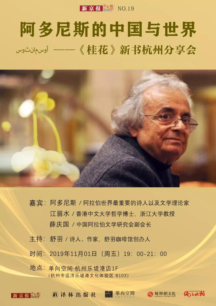 文化客厅第十九场,新京报·文化客厅联合译林出版社、单向空间、钱江晚报,邀请到诗人阿多尼斯、浙江大学教授江弱水,阿多尼斯指定的其诗歌中文译者、北京外国语大学阿拉伯学院教授薛庆国,诗人、作家舒羽将围绕阿多尼斯的长诗《桂花》,对话阿多尼斯眼中的中国和世界。