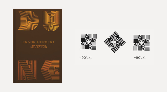企鹅经典“银河系列”之《沙丘》封面。书封中的DUNE很特别,每个字母都由与右边类似的U形结构组成,因此它无论如何90度旋转,读出来的都是DUNE。据设计师介绍,这个字母游戏紧密结合了小说的背景——银河系中一颗重要的战略行星,各色人物在通过不同角度看待这颗星球。图片来自《经典企鹅:从封面到封面》。