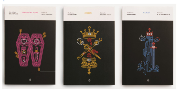 鹈鹕系列之莎士比亚系列。从左到右依次为《罗密欧与朱丽叶》《麦克白》《哈姆雷特》。现代风的插画为莎士比亚注入了新生命。