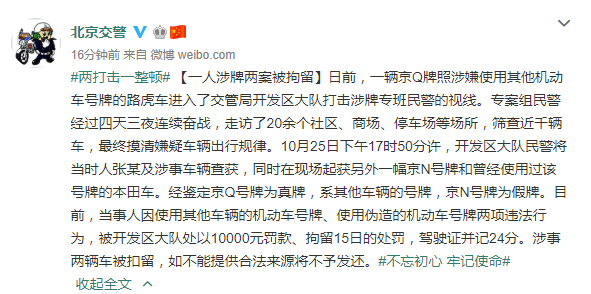 原标题:男子使用他车号牌并伪造车牌 北京交警:罚款并拘留