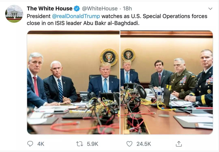 美国白宫公布了特朗普和几位官员在白宫战情室观看美军对巴格达迪突击行动的照片,被网友怀疑摆拍。
