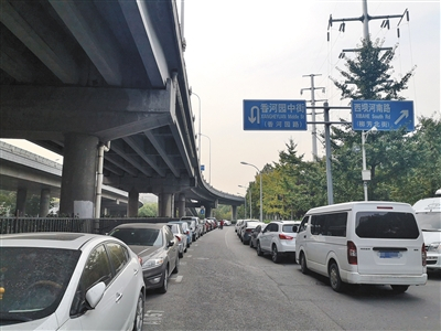 香河园北街道路两侧停满了社会车辆。新京报记者 张静雅 摄