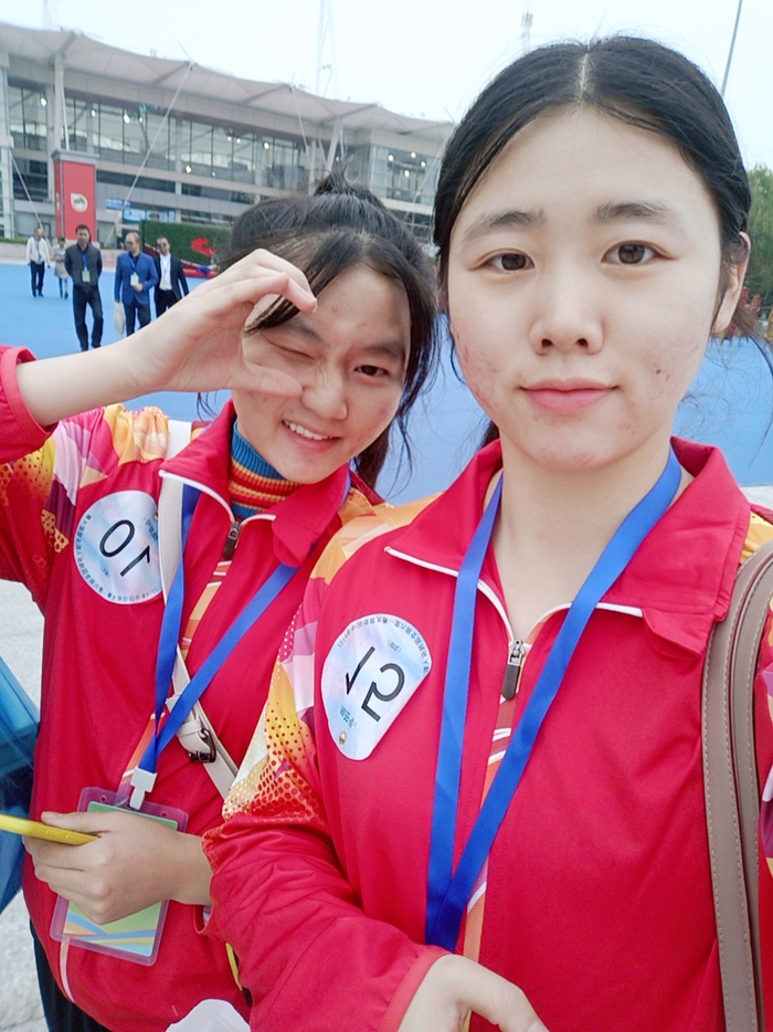 陈朵(左)与队友在赛场外自拍合影留念。受访者供图