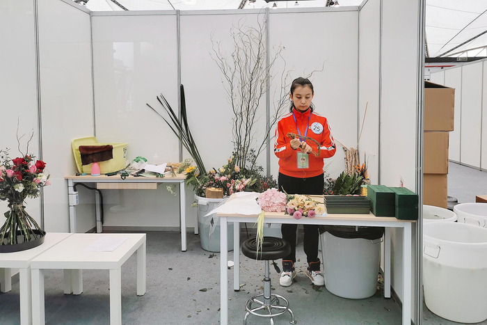 比赛当天,随队人员不允许进入赛场,王娟只能在酒店等待长达一天的比赛结束。“平均每束花需要一两个小时才能完成。”赛场内,每位选手进入各自隔间,进行封闭考核。三个大水桶浸泡着几十种花草,两张工作台,两个展示台,一个工具箱,是参赛选手所能依靠的所有。
