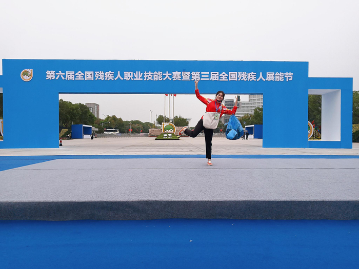 2002年出生的陈朵是插花项目赛场上年龄最小的一个。经历了匆忙慌乱的备赛和比拼,陈朵在昨天下午走出赛场,在门口蹦跳着拍下照片纪念,“最难的架构花完成啦,不过别的选手作品那么好,以后还要再努力!”听力障碍的陈朵给老师王娟发去文字消息。