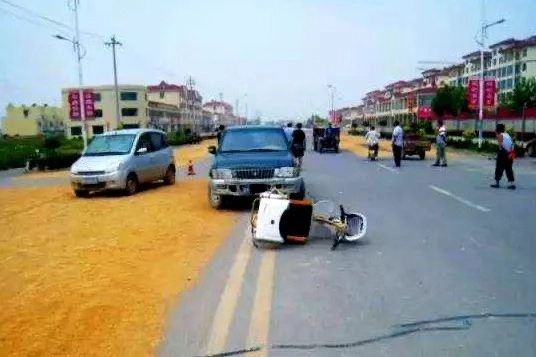 2017年10月24日,陈杰(化名)将自家丰收的玉米晒到公路上,用电动三轮车隔挡了一下,防止玉米被过往的车辆辗轧。