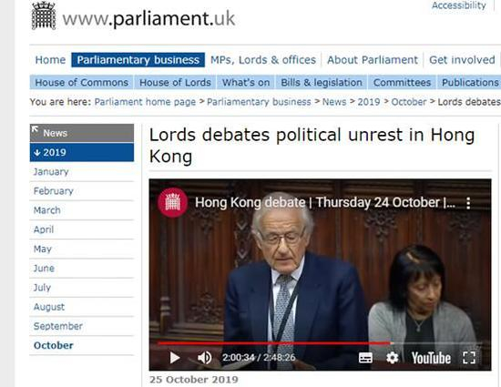 英国议会网站25日发布当天辩论的视频,并介绍称,英国上议院议员就最近的香港问题进行了辩论。