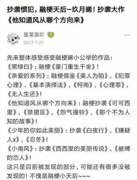 平台方面不惩罚,大概跟法律在这方面的空白有关:要在法律上判定抄袭,必须有达到“复制粘贴”级别的证据,甚至要达到某个比例,但是“融梗”却巧妙地规避这一点。
