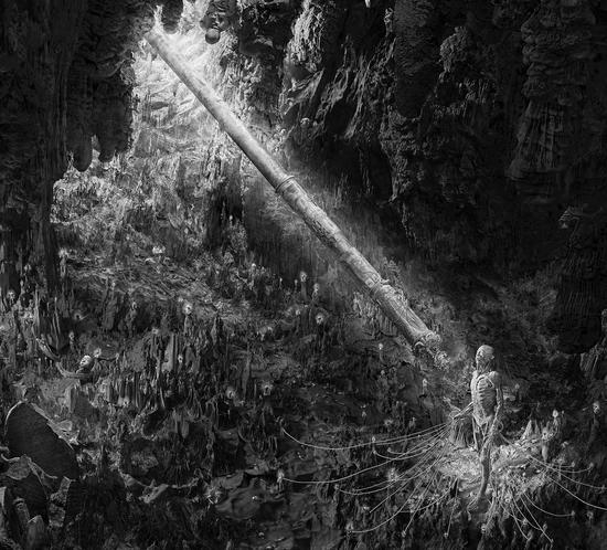 我构建了一根巨大权杖,它由缴获的美军炮管、庙顶经幢、欢喜金刚共同组成。从洞口最光明之处斜插进来。我关注探讨着历史上权力与民众,英雄与凡人的复杂关系,在我看来,历史可以被看成时间空间与人类之间彼此塑造的过程。在文明演进的沉积岩中,弥散着人性的油腻液体,它们像是由无数逝去的生命转化而成的原油,深色血浆一般充满能量,蕴藏着可以发光发热的物质,同时又会遇缝则钻隙、遇低则下流、暗黑粘滞,色斑污迹一样,难以漂洗,无法清除。