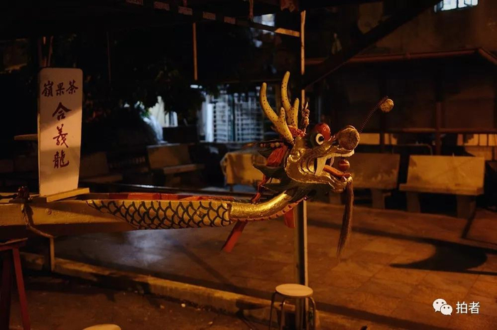 △ 天后宫前的广场上,一艘退役的龙舟被固定在木架上,舟身的白色木板上用楷书端正的写着“茶果岭 合义龙 ”六个字。