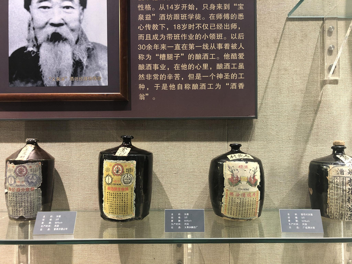 展品中有当时的汾酒包装,容量为3斤的窄口陶瓶贴着略显简陋的纸质标签,标签用古朴的推介语写道“清香芬芳实于卫生有利,物美价廉凡大雅客商”。在介绍文字的围绕中,“义泉涌杏花村汾酒”几个繁体大字醒目而立。