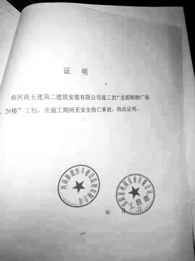 记者还见到了加盖有虚假公章的证明以及关于印章的鉴定文书。在“由河南五建第二建筑安装有限公司施工的‘龙都购物广场1#、2#楼’工程,在施工期间无安全伤亡事故”证明文件里,加盖有“河南新建恒丰建设监理有限公司”和“信阳星利园实业有限公司工程部”印章。