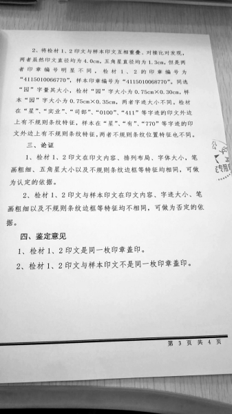 信阳市公安局刑事科学技术鉴定所出具了关于印章的鉴定文书,其中一条鉴定意见为“检材1、2印文与样本印文不是同一枚印章盖印”。 本文图片 大河报大河客户端