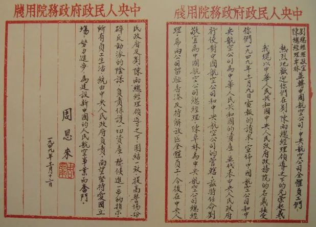 1949年11月9日,在中国共产党的直接领导下,原中国航空公司总经理刘敬宜和中央航空公司总经理陈卓林率领2000多名职工在香港宣布起义,两家公司的12架飞机从香港起飞,直奔解放区,胜利飞抵北京、天津,回到新中国的怀抱,这就是当时震惊中外的“两航起义”。毛泽东和周恩来致电祝贺,称之为“一个有重大意义的爱国举动”、一个“光荣起义”。