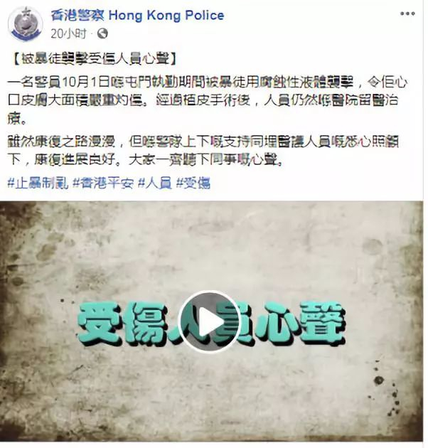 昨晚,香港警方在官方脸书发布了一段“被暴徒袭击受伤人员心声”的视频,这名警员此前在屯门执勤期间被暴徒用腐蚀性液体袭击,皮肤大面积严重灼伤。他在视频中说:“我会尽快康复,重投前线,再一次与大家并肩作战!当然更希望,当我康复的时候,香港已经恢复太平。”