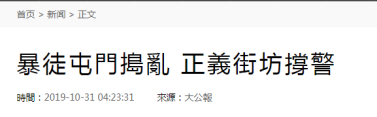 据香港《大公报》31日报道,有暴徒昨晚借口屯门区“受不明气体侵袭”是警方造成的,在屯门大兴行动基地外聚集,并不断用粗言秽语挑衅在场执勤警员,拆毁路边铁栏设路障,四处破坏,还扬言要将行动升级。