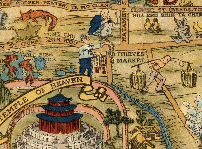 1936年英国画家窦尔思绘制的北京地图中,将夜市(鬼市)径直译为“小偷市场”(Thieves' Market)。