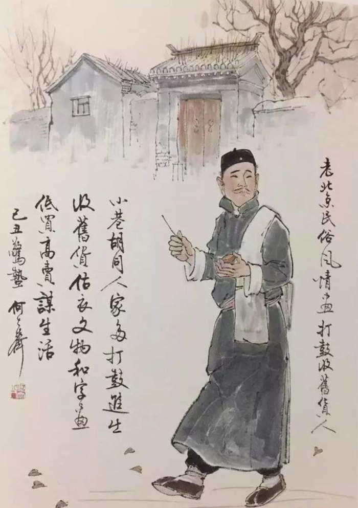 “担二筐,前晾,后以布覆,收买一切衣物,有岔眼物,藏入后筐。黑早上南北小市便卖,行携瓯口大小迸鼓,击之。人谓之‘买死人,卖死人’。”